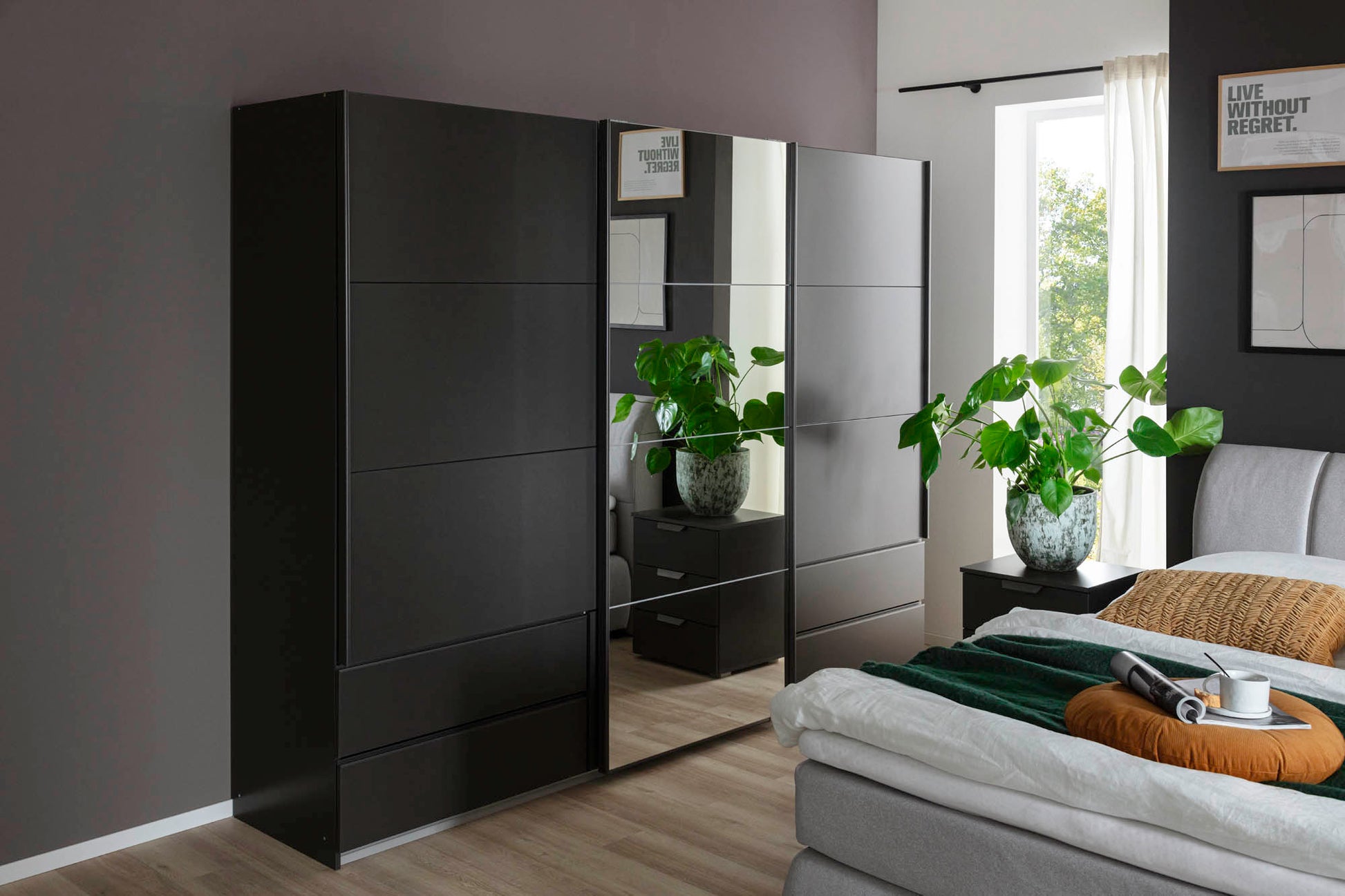 Der Schwebetürenschrank bietet großzügigen Stauraum und eignet sich ideal für Räume mit wenig Platz vor dem Schrank. Eine Spiegeltür unterstützt beim Ankleiden und sorgt für eine freundliche Raumwirkung. In den vier Schubkästen lassen sich kleinere Kleidungsstücke und Accessoires ordentlich verstauen.